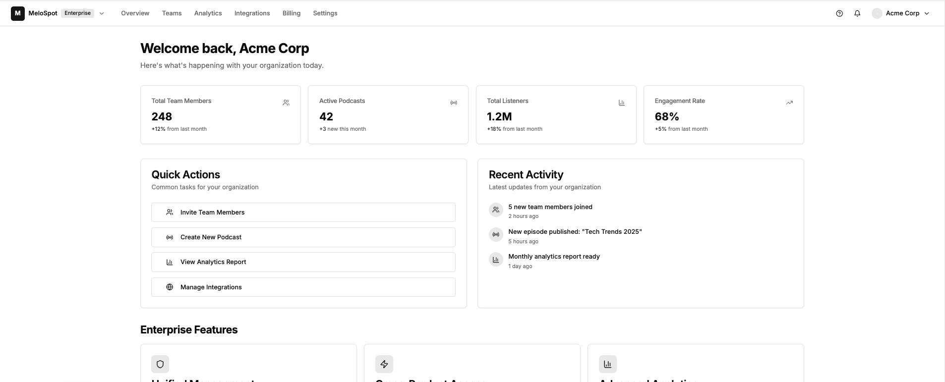 Access the complete MeloSpot suite with unified team management and cross-product analytics